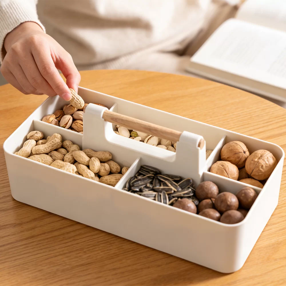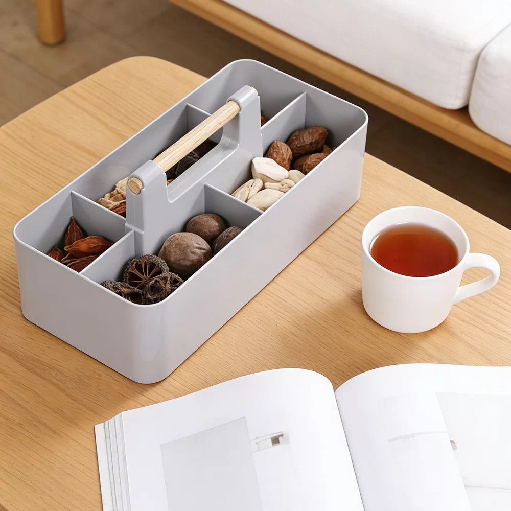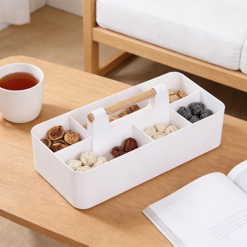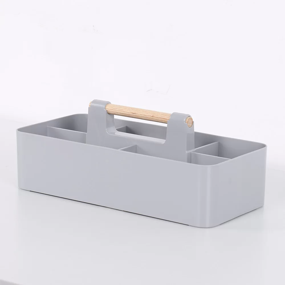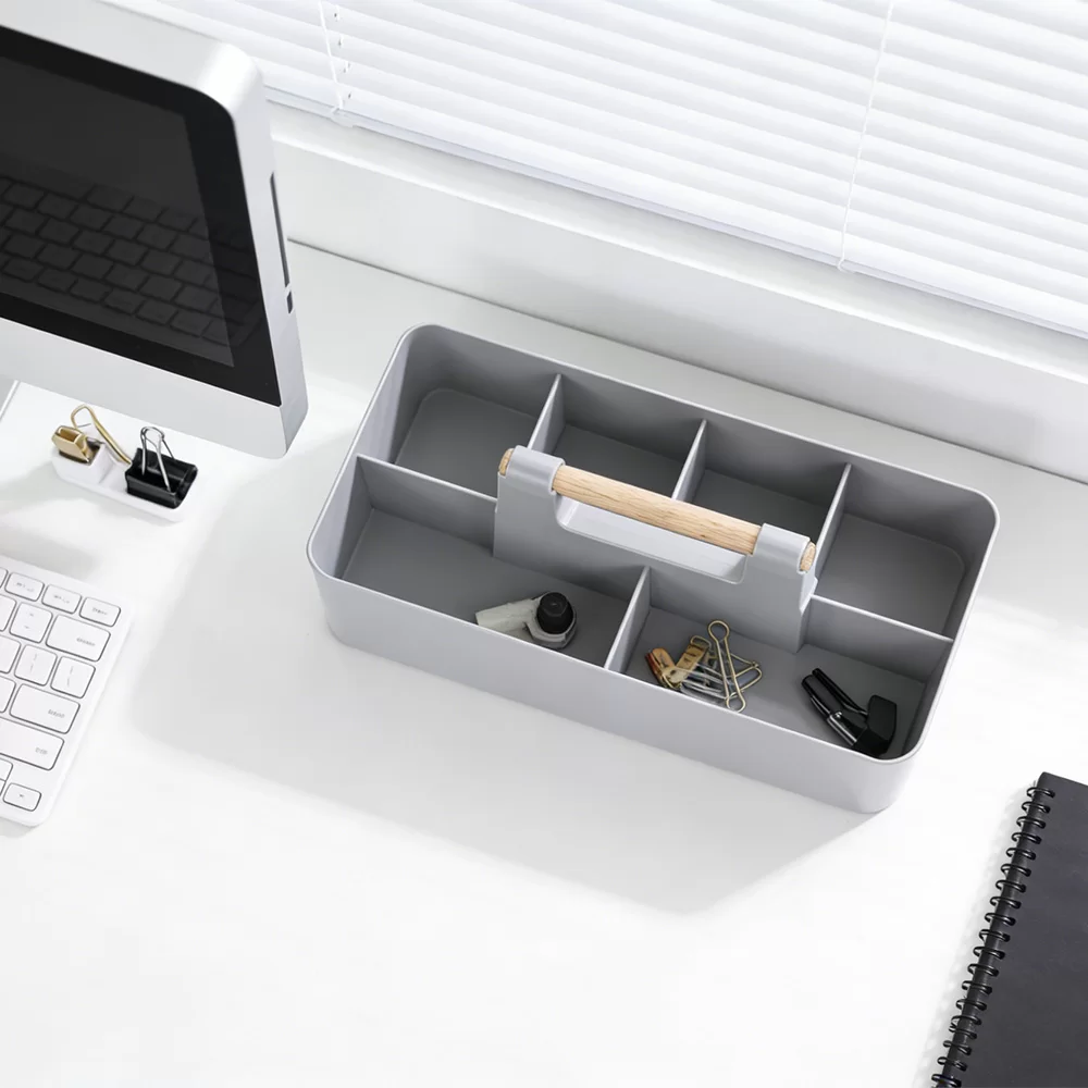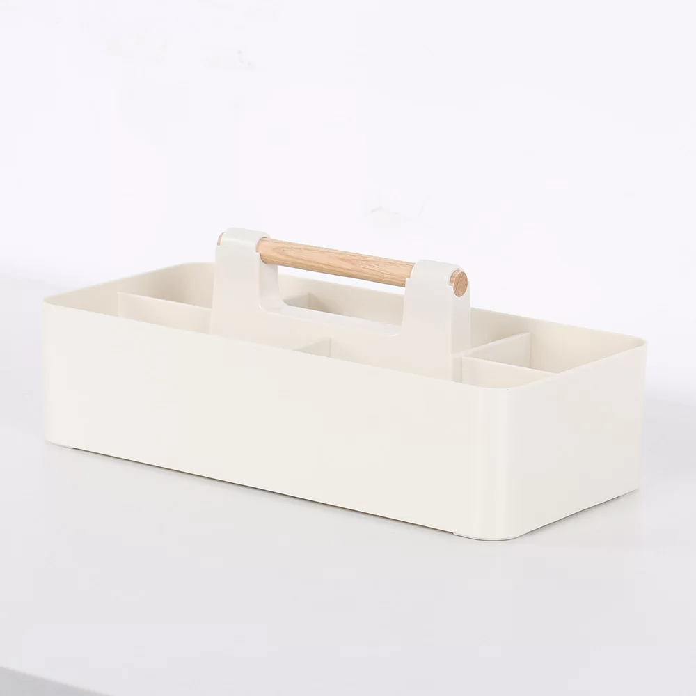 हाइलाइटहरू: आरामदायी पोर्टेबिलिटी र उच्च-अन्त लुकको लागि प्रिमियम वास्तविक काठको ह्यान्डलको सुविधा दिन्छ। स्टेशनरी, सौन्दर्य प्रसाधन, वा दैनिक अत्यावश्यक वस्तुहरूको व्यवस्थित भण्डारणको लागि स्मार्ट रूपमा विभाजित डिब्बाहरू। टिकाउ, म्याट-समाप्त शरीर जसले औंठाछाप र खरोंचहरूको प्रतिरोध गर्दछ।